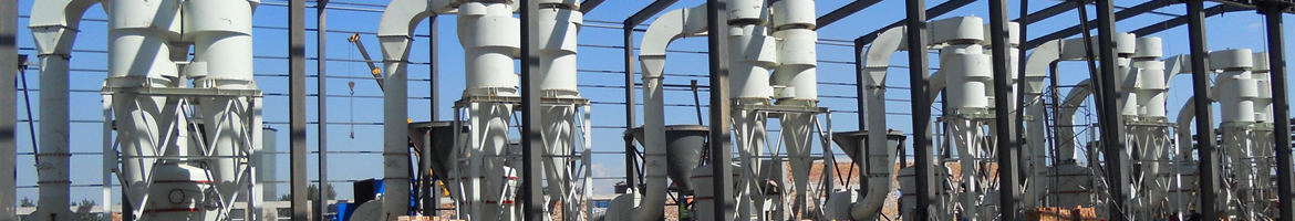 大塊物料經顎式破碎機破碎到所需粒度后,由提升機送至儲料斗,再由皮帶機將物料均勻定量連續(xù)地送入6臺MTW175歐版磨的主機磨室內進行研磨。粉磨后的物料被風機氣流送入選粉機進行分級,在選粉機葉輪的作用下,不符合細度要求的物料落入磨室內重新碾磨,合格的物料則經空氣斜槽進入旋風集粉器內,進行分離收集,經排料裝置排出即為成品粉體。