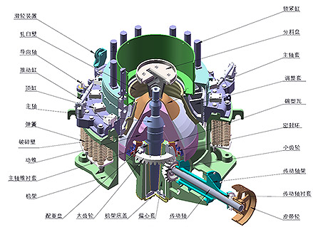 CS圓錐破碎機(jī)主要由機(jī)架、定錐總成、動錐總成、彈簧機(jī)構(gòu)、碗型軸架部和傳動等部分組成;其輔助部分由電氣系統(tǒng)、稀油潤滑系統(tǒng)和液壓清腔系統(tǒng)組成。